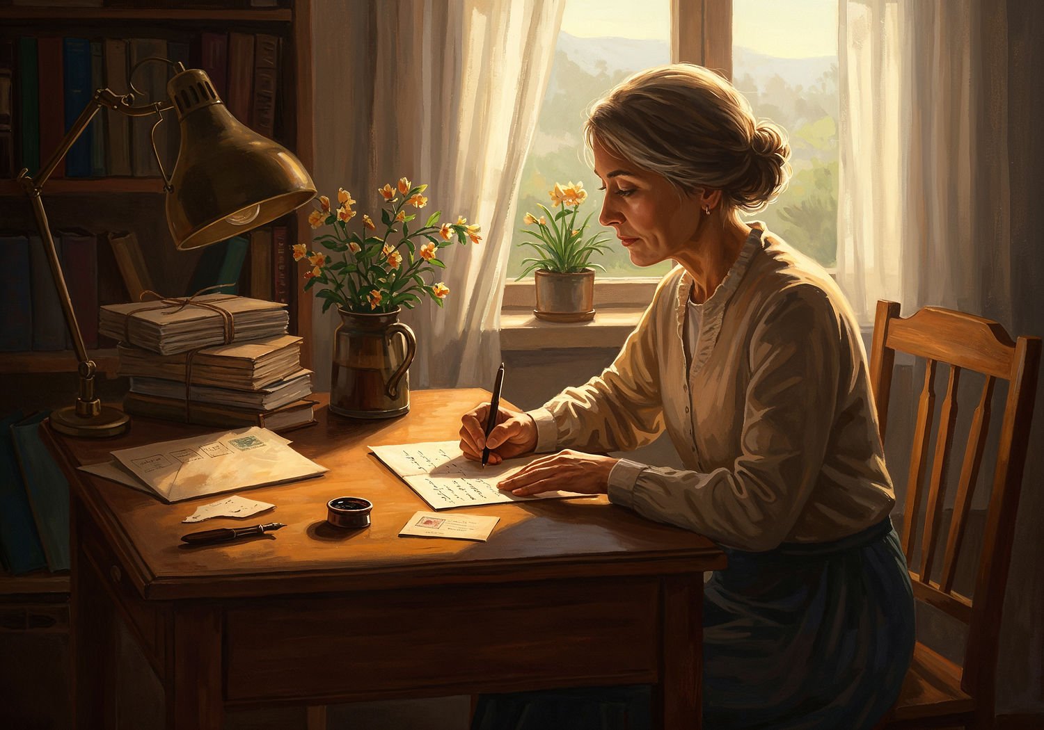 Impressionist painting, plein air, vibrant colors, capturing the moment, flickering light, visible short brush strokes, broken color technique, soft focus Impressionist painting, plein air, vibrant colors, capturing the moment, flickering light, visible short brush strokes, broken color technique, soft focus A cozy scene of a middle-aged woman sitting at a wooden desk in a sunlit room, handwriting a heartfelt letter on textured paper with a fountain pen, an open envelope nearby stamped with a vintage postmark, while across the room a stack of old letters tied with ribbon rests on a shelf, evoking emotional connection and nostalgia; in the background, a faint silhouette of a distant friend reading a similar letter by a window, symbolizing bridged distance and reduced loneliness. ;Image without icons or texts. Style: Oil painting on canvas, impasto texture, thick layers of paint, high-key lighting, atmosphere of a hazy morning; ;Image without icons or texts. Style: Oil painting on canvas, impasto texture, thick layers of paint, high-key lighting, atmosphere of a hazy morning;
