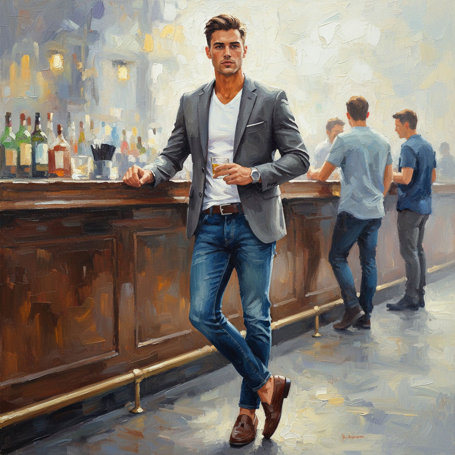 Impressionist painting, plein air, vibrant colors, capturing the moment, flickering light, visible short brush strokes, broken color technique, soft focus Impressionist painting, plein air, vibrant colors, capturing the moment, flickering light, visible short brush strokes, broken color technique, soft focus A confident young man with an athletic build, broad shoulders, and V-shaped silhouette, standing in a dimly lit evening bar, wearing a slim-fit gray blazer that accentuates his torso, a fitted white t-shirt underneath, slim indigo jeans that taper to his ankles, brown leather loafers, and a silver watch on his wrist; he leans casually against the bar counter with a drink in hand, exuding nonchalant style and poise. ;Image without icons or texts. Style: Oil painting on canvas, impasto texture, thick layers of paint, high-key lighting, atmosphere of a hazy morning; ;Image without icons or texts. Style: Oil painting on canvas, impasto texture, thick layers of paint, high-key lighting, atmosphere of a hazy morning;