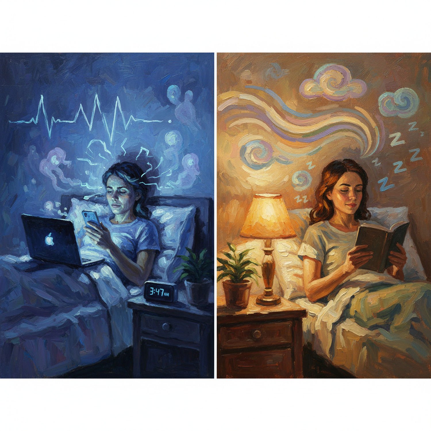 Impressionist painting, plein air, vibrant colors, capturing the moment, flickering light, visible short brush strokes, broken color technique, soft focus Impressionist painting, plein air, vibrant colors, capturing the moment, flickering light, visible short brush strokes, broken color technique, soft focus A split-scene illustration: on the left, a person in bed at night holding a smartphone and laptop emitting bright blue light rays toward their eyes, with disrupted sleep waves and a clock showing late hours, melatonin hormone icons fading; on the right, the same person relaxing in a device-free bedroom, reading a paper book under warm lamp light, with flowing melatonin waves and peaceful sleep symbols like Zzz, representing improved rest. ;Image without icons or texts. Style: Oil painting on canvas, impasto texture, thick layers of paint, high-key lighting, atmosphere of a hazy morning; ;Image without icons or texts. Style: Oil painting on canvas, impasto texture, thick layers of paint, high-key lighting, atmosphere of a hazy morning;