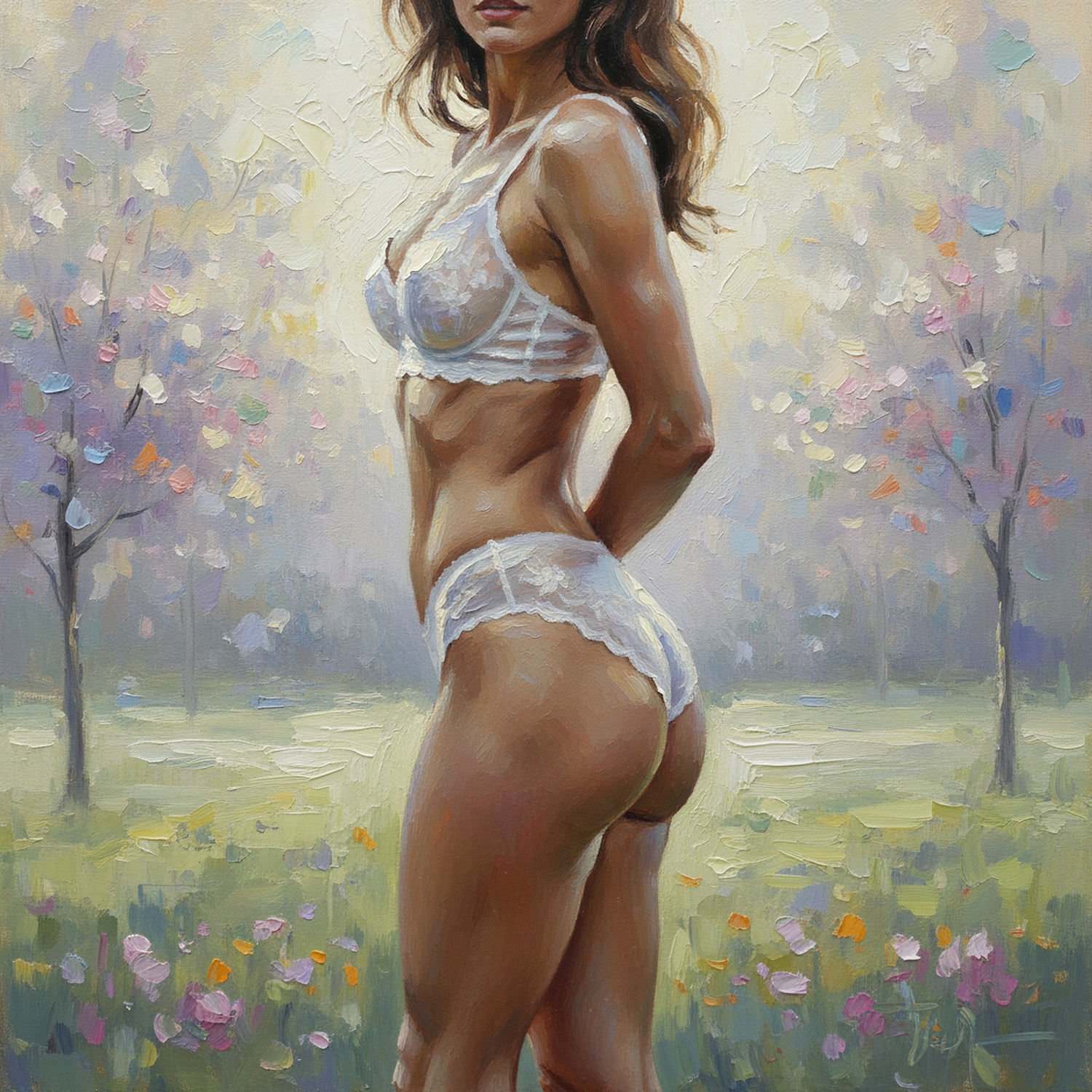 Impressionist painting, plein air, vibrant colors, capturing the moment, flickering light, visible short brush strokes, broken color technique, soft focus A confident woman standing sideways in elegant lingerie, showcasing her smoothly contoured buttocks and thighs with natural curves and toned proportions, her posture exuding sensuality and self-assurance, with subtle highlights on the enhanced lower body silhouette against a neutral background. ;Image without icons or texts. Style: Oil painting on canvas, impasto texture, thick layers of paint, high-key lighting, atmosphere of a hazy morning;