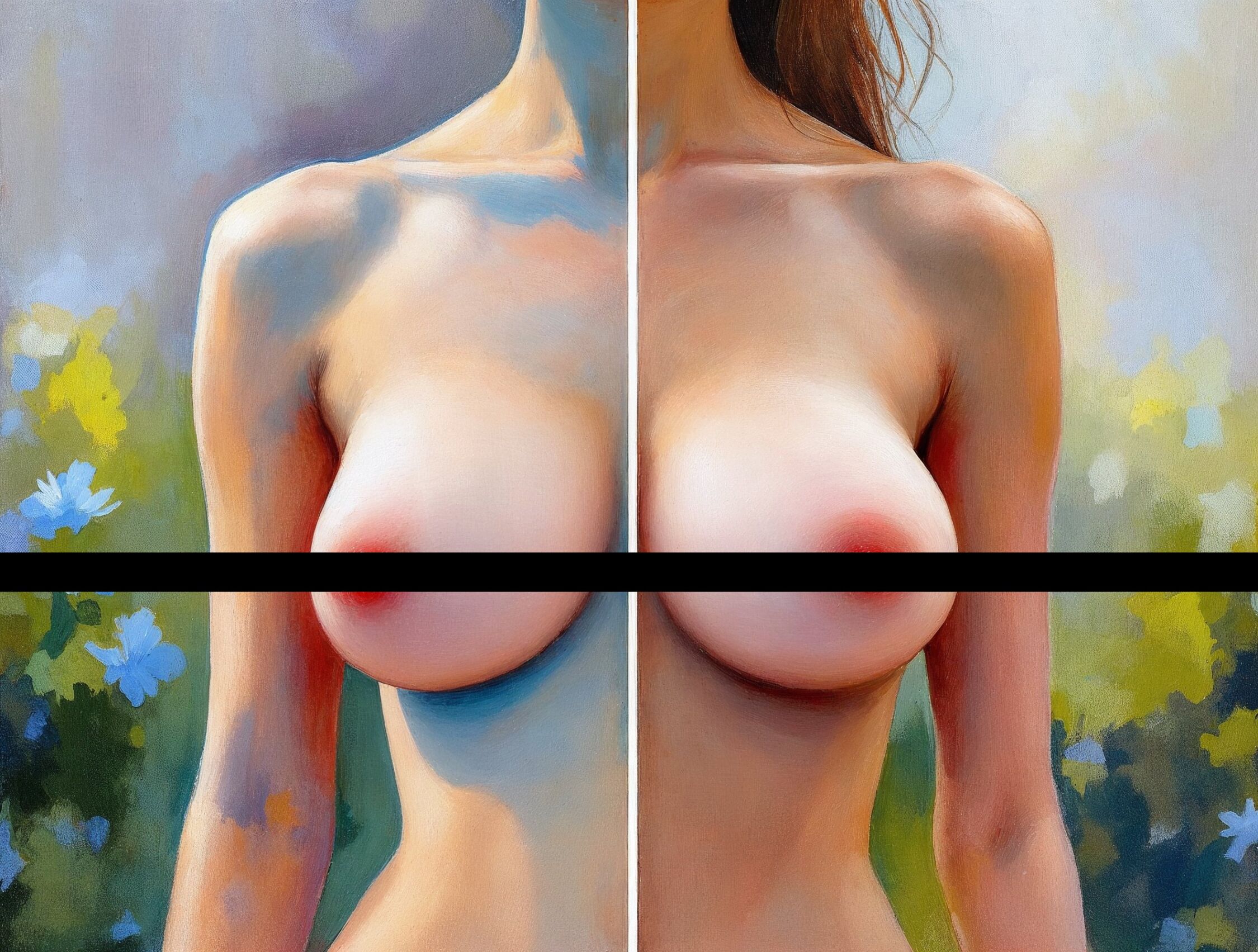 Impressionist painting, plein air, vibrant colors, capturing the moment, flickering light, visible short brush strokes, broken color technique, soft focus A split-image illustration showing a woman’s upper body silhouette: on the left side, an asymmetrical torso with one underdeveloped breast and uneven shoulders suggesting Poland syndrome or tuberous breast deformity, causing a tilted posture; on the right side, the same woman post-surgery with balanced, symmetrical breasts, straight posture, and harmonious body proportions, symbolizing regained confidence and physical equilibrium. ;Image without icons or texts. Style: Oil painting on canvas, impasto texture, thick layers of paint, high-key lighting, atmosphere of a hazy morning;