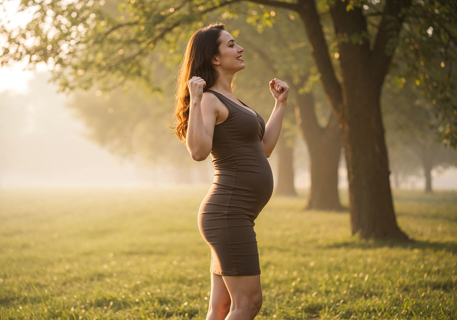 Impressionist painting, plein air, vibrant colors, capturing the moment, flickering light, visible short brush strokes, broken color technique, soft focus A confident woman standing in profile view, showcasing her flat and toned abdomen after abdominoplasty, wearing a fitted dress that highlights her improved silhouette, with a joyful expression and arms raised in empowerment, symbolizing regained self-confidence and intimacy post-pregnancy or weight loss. ;Image without icons or texts. Style: Oil painting on canvas, impasto texture, thick layers of paint, high-key lighting, atmosphere of a hazy morning;