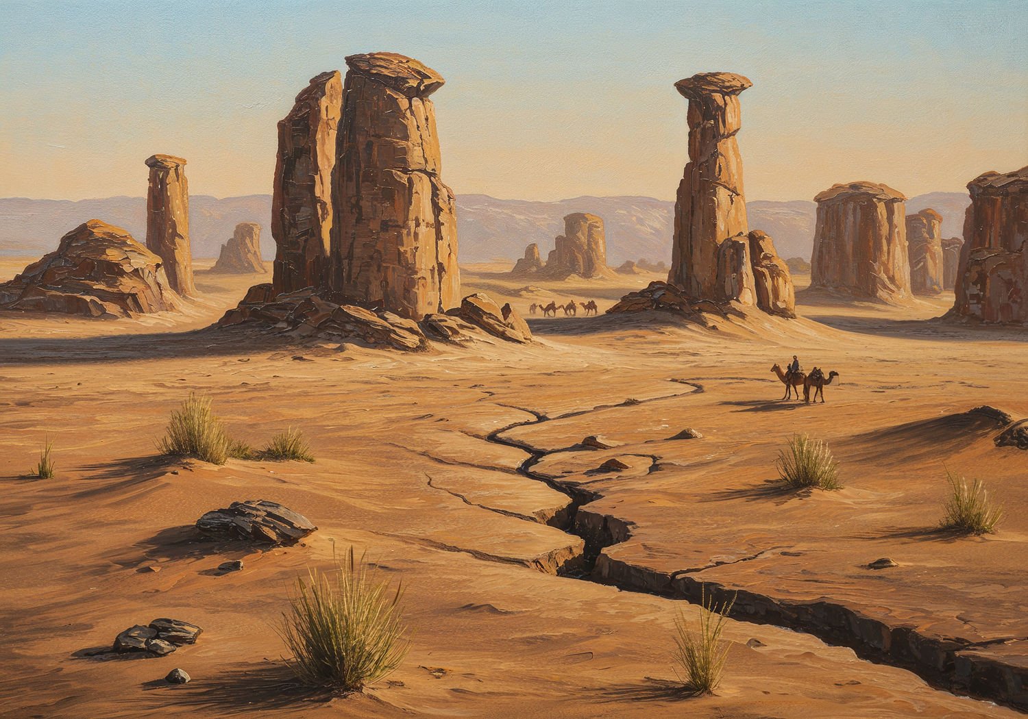 Impressionist painting, plein air, vibrant colors, capturing the moment, flickering light, visible short brush strokes, broken color technique, soft focus A vast, surreal desert landscape of Dasht-e Lut under a scorching sun, featuring towering kalut rock formations resembling Martian pillars up to 150 meters high, black volcanic basalt rocks absorbing intense heat with shimmering air mirages rising from the ground, scattered yardangs elongated by wind erosion, sparse adapted desert life like a hidden scorpion near a crack and ephemeral grasses after rare rain, distant silhouette of a historical caravan with camels crossing the hot sands toward an oasis, dramatic shadows and red iron oxide hues on the rocks, emphasizing extreme dryness and otherworldly geological wonders. ;Image without icons or texts. Style: Oil painting on canvas, impasto texture, thick layers of paint, high-key lighting, atmosphere of a hazy morning;