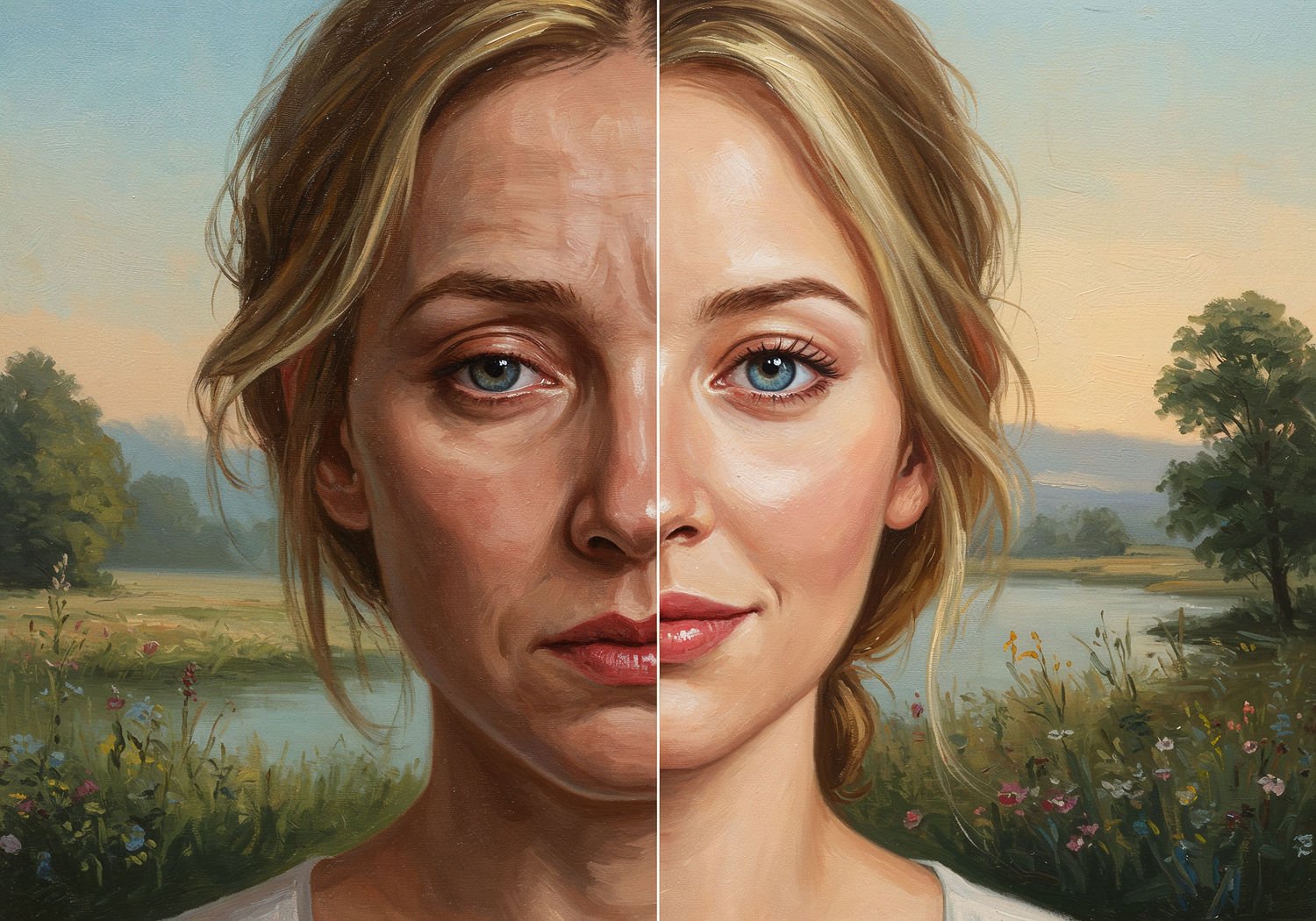 Impressionist painting, plein air, vibrant colors, capturing the moment, flickering light, visible short brush strokes, broken color technique, soft focus A split-image illustration showing a woman’s face divided in half: on the left side, she has drooping eyelids with a tired, aged expression, looking downward with subtle sadness; on the right side, after eyelid surgery, her eyes are wide open and youthful, with a confident, sensual gaze directly engaging the viewer, accompanied by a soft smile suggesting flirtation and renewed energy. ;Image without icons or texts. Style: Oil painting on canvas, impasto texture, thick layers of paint, high-key lighting, atmosphere of a hazy morning;